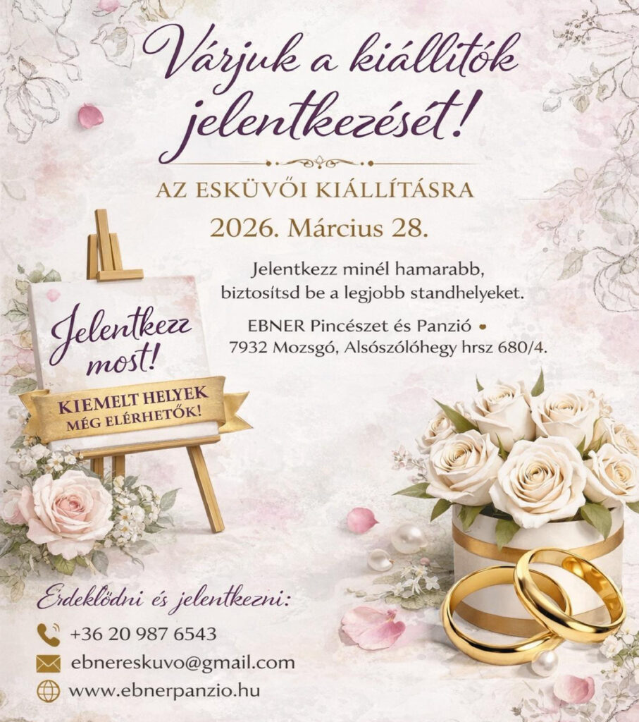 Gyertek el Baranya megye egyik legcsodálatosabb panorámájával megáldott esküvőkiállítására, ahol egy helyen találod a legjobb szolgáltatókat: menyasszonyi ruhák, férfi öltönyök, dekorációs ötletek, fotó, videó, torták, meghívók, kozmetikus, ékszerész, vendéglátó helyszín, aprósütemények, Dj, és sok érdekesség.